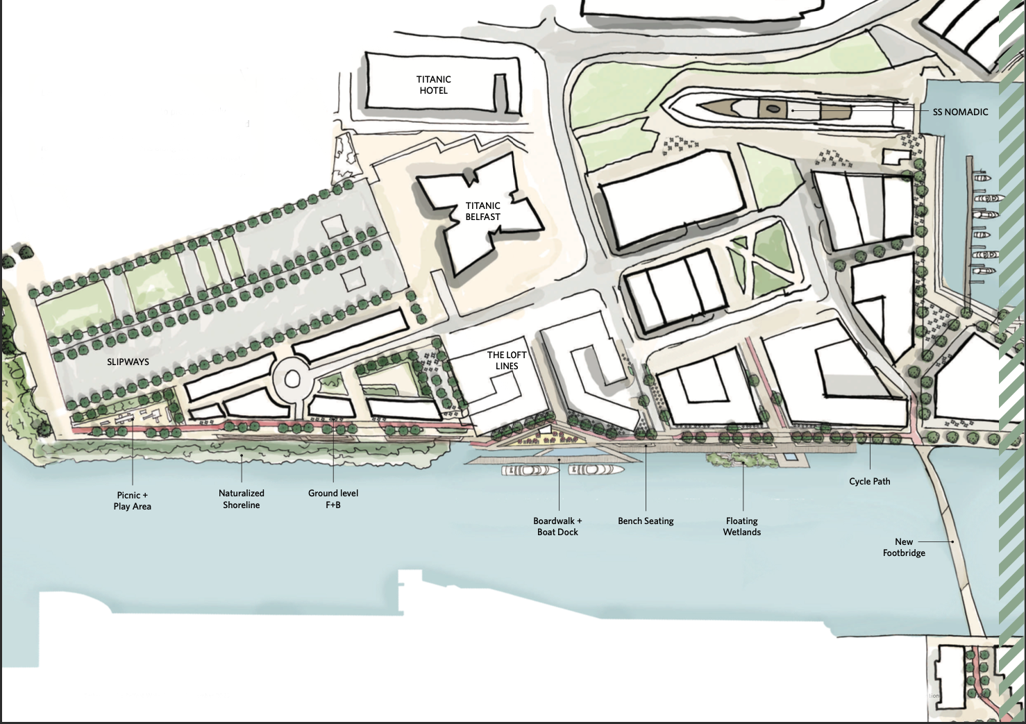 Surrounding the iconic Titanic Belfast, Slipways and Titanic Hotel, this area of waterfront holds the heart of the Titanic Quarter and has the potential to provide a truly world-class waterfront promenade and a new day and night destination for the residents of Belfast. With a range of design interventions along the river’s edge, the promenade could become an important cultural, economic, ecological and social resource for the city.