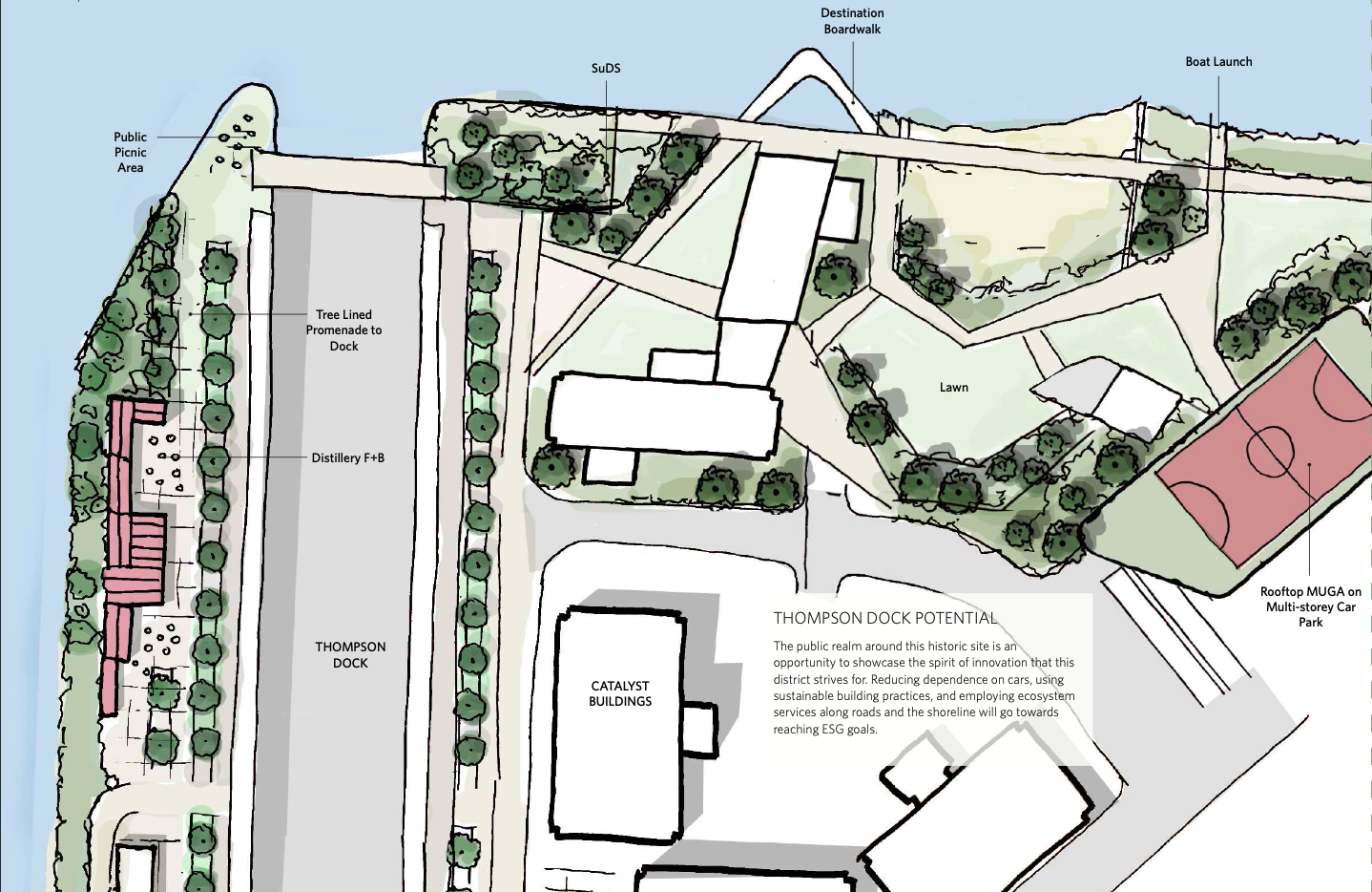 As a continuation of the Harbour Park, a softer, green corridor including a living shoreline, trim trail, and a boat launch could lay the foundations for the emergence of a ‘tech campus’ landscape for Catalyst and connect Thompson Dock with the wider hinterland.