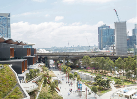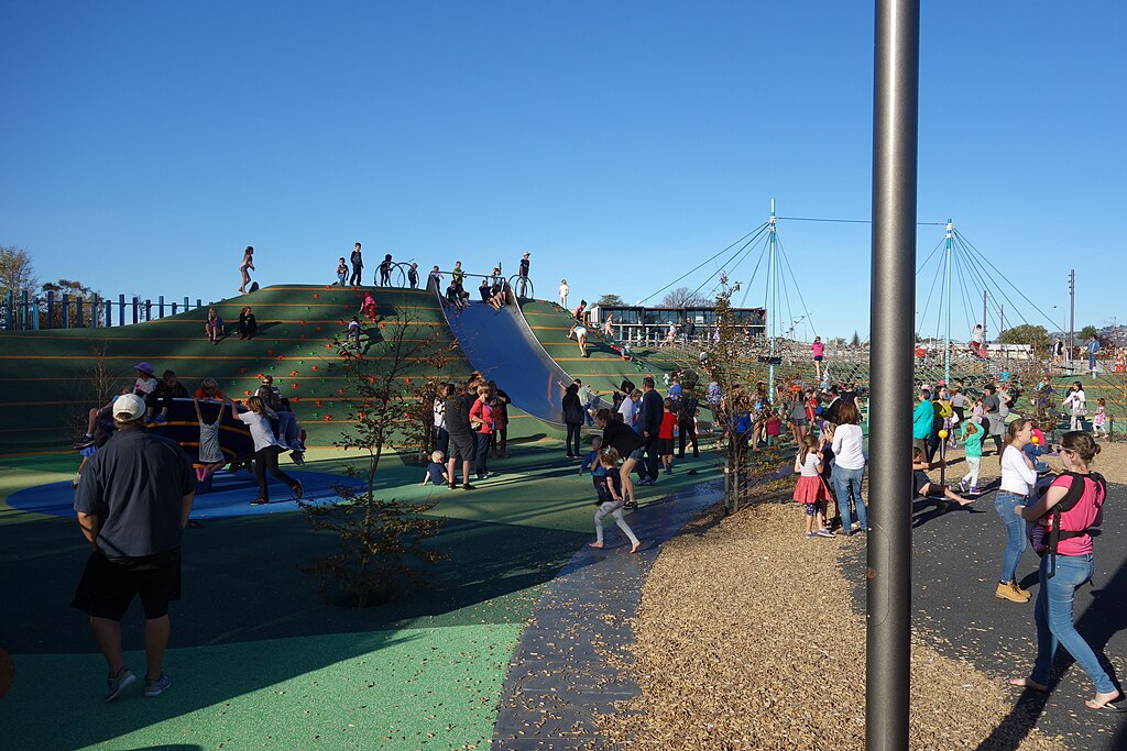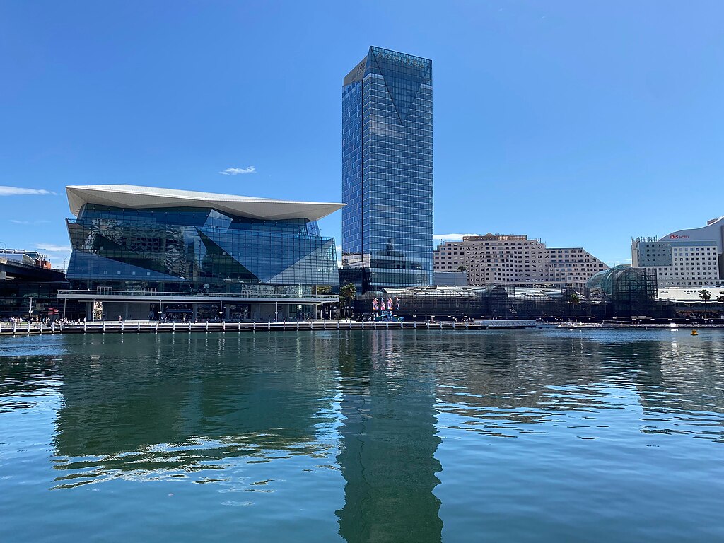 Cafes and concessions are built into the hillside leading to Darling Harbour. Visitors can enjoy dipping a toe in the water feature, exploring the playground, or getting out of the sun under the overpass.