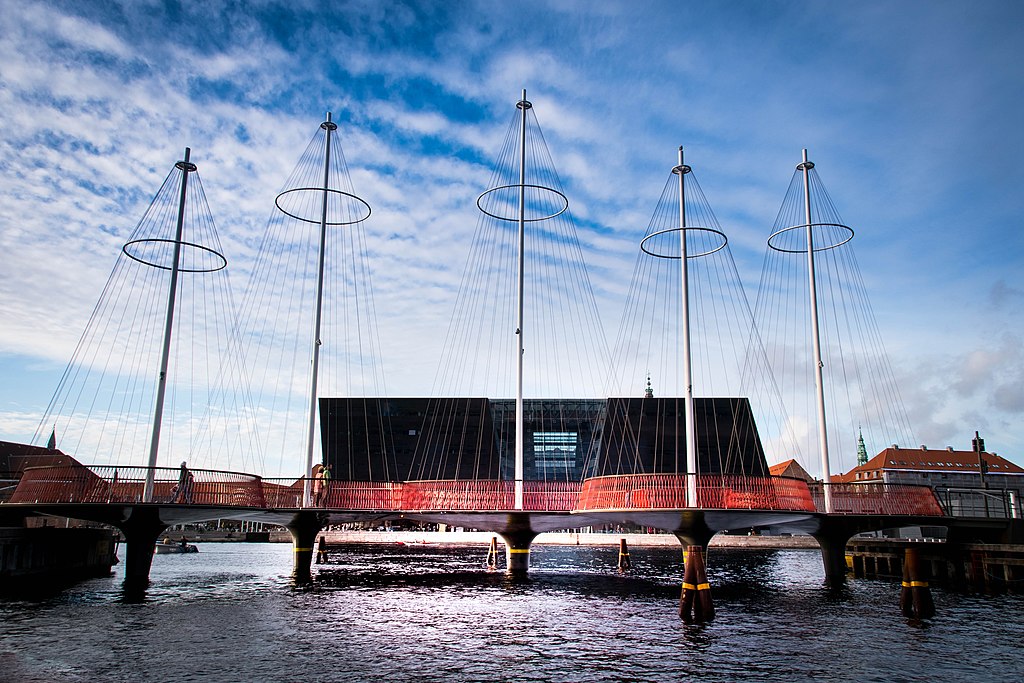 Circular platforms topped by tall masts make up a bridge for pedestrians and cyclists that spans Copenhagen’s Christianshavns Kanal. Thin steel cables extend from the top of the masts – the highest of which rises up twenty-five metres – to the platform’s circular railings. Accessible via ramps at each end, the five steel platforms vary in diameter from ten to fourteen metres and are arranged to create a staggered, zigzag path that inspires uncertainty and pause. Cirkelbroen is lit at night, and one section rotates to allow large boats to pass into and out of the canal.