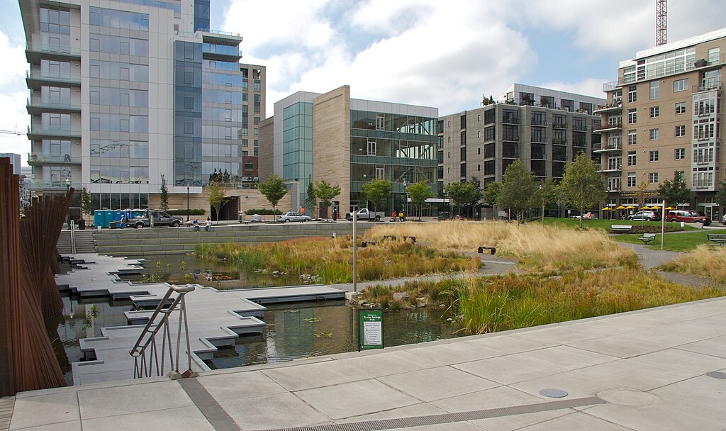 Tanner Springs successfully reconnects a post industrial site to its former natural wetland character. Combining surface water, art, and wetland planting, the landscape acts as a natural attenuation system, conveying stormwater run-off from neighbouring streets to feed the lake.