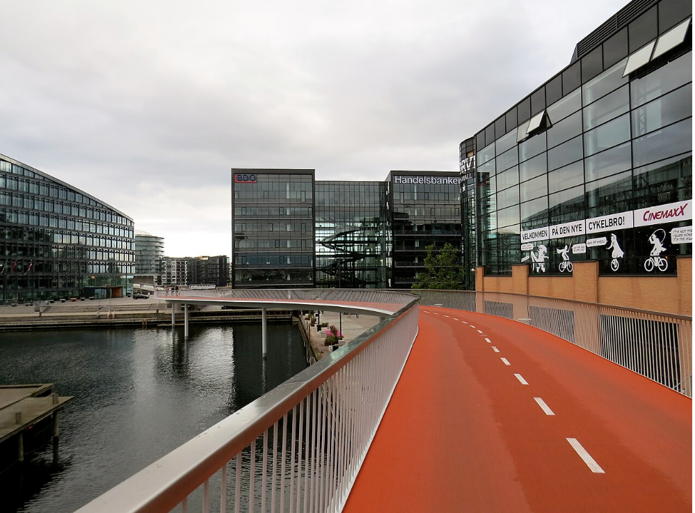 Raised above the ground plane, the cycle network in Copenhagen is connected with the Cykelslangen —a striking and functional piece of cycle infrastructure.