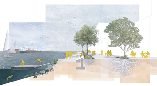 Soft living shorelines reintroduce native flora and fauna to waterfronts, providing an environmentally functional and resilient edge condition. Rewilding where possible will increase overall biodiversity, improve air and water quality whilst affording increased access to the water’s edge and wildlife viewing opportunities.
