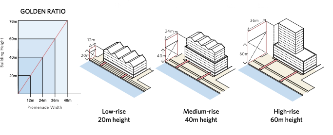 The Golden Ratio serves as a guide to create proportional spaces. As a rule of thumb, the taller the building is, the wider the public space is so that people feel comfortable and safe in the public realm. While the impression of expansive space is a benefit of waterfront views, the water can feel like a physical barrier at ground level, so proportions must be well balanced.