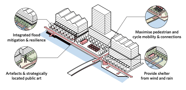 The experience along the waterfront promenade should be coherent but varied. Consistency in pedestrian and cycle paths, signage and wayfinding, and furniture signals a public space is for everyone. Site specific artefacts, storytelling, heritage, art, and shelters can help create bespoke destinations and a sense of place. It is crucial that flood mitigation and environmental resilience are integrated into the design of the public realm.