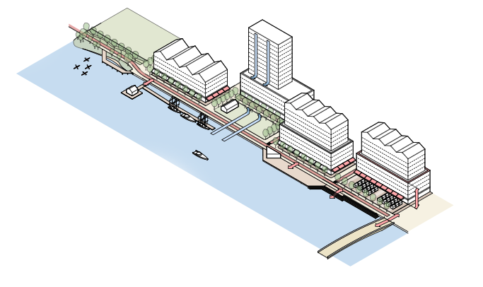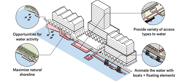 Interventions in the public realm, water’s edge and buildings must be considered with equal importance.